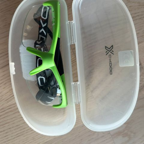 Exel urheilulasit mustalla ja keltaisella kehyksellä. Soveltuvat urheilukäyttöön ja tarjoavat suojaa silmille aktiivisissa tilanteissa. Lasten koko. Sivussa pojan nimi ja luokka.