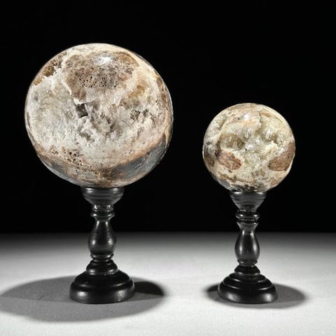 Kaunis pari Maligano Jasperin ja kvartsikiteiden palloja sisältävä sarja kustomoidulla jalustalla.