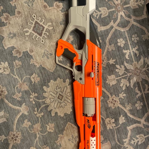 Nerf N-Strike Elite -leikkikivääri, sininen ja oranssi väri, mukana useita lisäosia kuten tähtäin, kahva ja lipas. Lasten leluase, joka on valmistettu muovista.