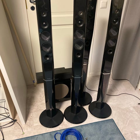 - Kaiuttimet: Mukana lattiakaiuttimet (2x etukaiuttimet ja 2x langattomat takakaiuttimet), keskikaiutin
