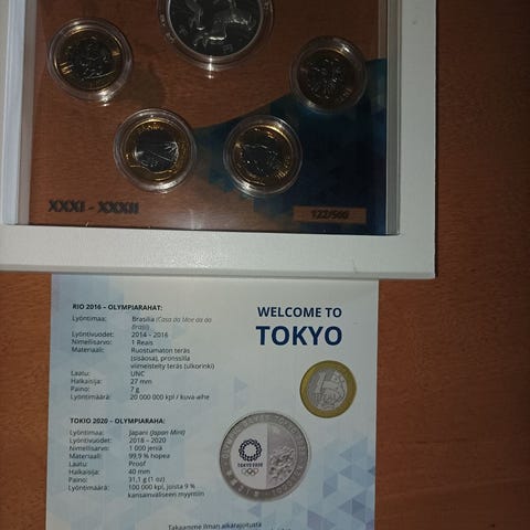 Olympic Games kultaiset mitalit, joissa on eri urheilulajeja kuvaavia kaiverruksia ja symboleja. Mitalit ovat pyöreitä ja kullattuja, ja ne esittävät erilaisia urheilutoimintoja kuten juoksua ja hyppyä. Mitalit ovat esillä läpinäkyvissä koteloissa.
