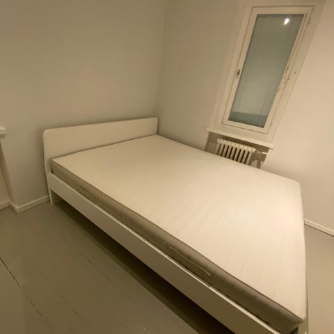 Hyväkuntoinen 180cm leveä sänky muuton tieltä pois. Sängyn runko kahdessa 90cm osassa. Joustinpatja 180cm leveä.