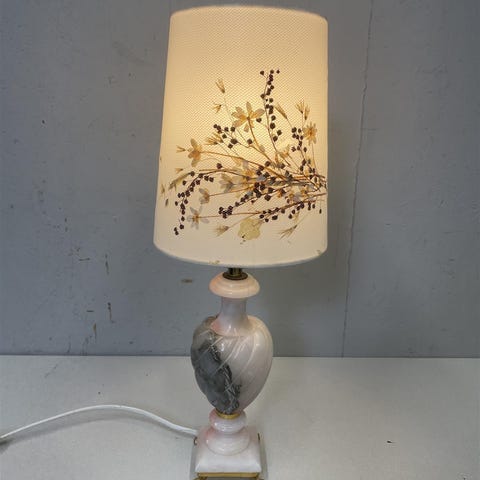 Vintage-pöytävalaisin, jossa on marmoria ja messinkiä. Valaisimen jalka on neliön muotoinen ja siinä on koristeelliset jalat, jotka tuovat lisää eleganssia. Valkoinen marmori ja messinkiset yksityiskohdat luovat hienostuneen ilmeen.Valaisimessa on joitakin käytön jälkiä, kuten pieniä naarmuja ja kulumaa messinkiosissa. Maadoittamaton pistoke.