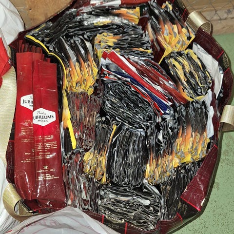 Pussillinen erilaisia kankaita.