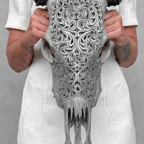 Tämä veistetty lehmän pääkallo on upea sisustuselementti, joka elävöittää minkä tahansa kodin tai ravintolan. Se ei ole vain henkinen ja kulttuurinen taideteos; se kertoo myös tarinan indonesialaisten alkuperäiskäsityöläisten perinteestä, jotka säilyttävät paikallisen käytännön käyttää jokainen osa eläimestä luodakseen ikuisen taideteoksen. Tämä pääkallo on käsityönä tehty Indonesiassa, missä kaiverrustaito eläinten pääkalloihin siirtyy isältä pojalle. He ovat hallitseet tätä ovelaa tekniikkaa ja tarvitsevat noin 5–6 päivää yksityiskohtaisten kaiverrusten, kuten tämän mallin, tekemiseen. Sarvet on myös veistetty boheemityylisesti.