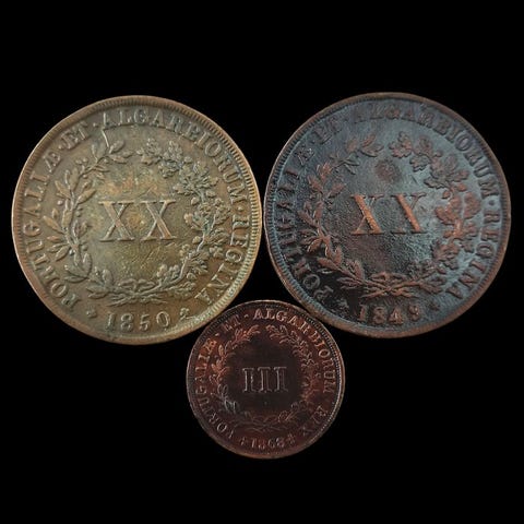 Portugali. D. Luís, D. Carlos II ja D. Manuel II. 60 kolikkopakkaus kuparista, eri vuosilta, sisältäen 3, 10 ja 20 reisin kolikoita.