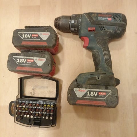 Akkukäyttöinen ruuvinväännin / porakone, joka toimii 18 voltin akulla. Kantolaukku mukana, jossa on paikka kahdelle akulle ja laturille. Akut ovat molemmat ihan loppu, mutta ruuvinväännin toimii, kunhan ostaa uuden akun.