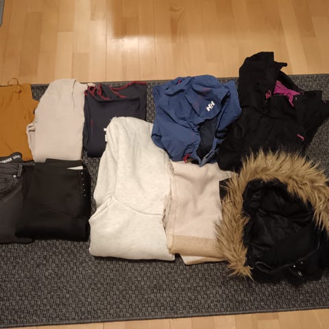 Kaksi jakkua, farkkutakki ja siisti pikkutakki. Urheilupaitoja, juoksutakki -ja liivi. Uikkareita 2 kpl. Paitoja enimmäkseen. Siistejä vaatteita. En jaksa kuvata tarkemmin.
