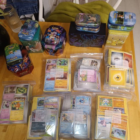 ➡️Neljä pokémonsettiä, joka sisältää kortteja, kolikoita, tarroja, suojataskuja, metallisen säilytysrasian ja korttikansion (ei näy kuvassa). 1 setti per lapsi.