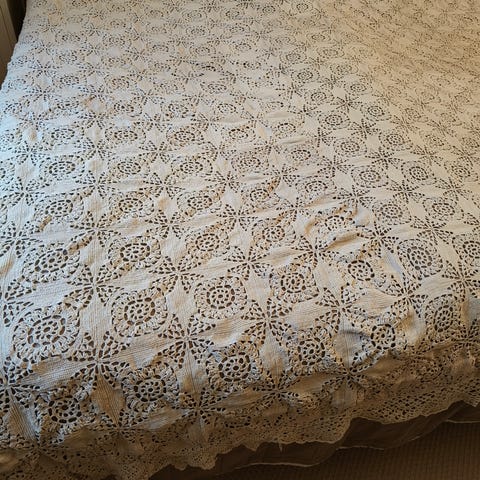 Joitakin tikkauksen lankoja purkautunut ja aika ohkaiseksi kangas kulunut jostain kohtaa