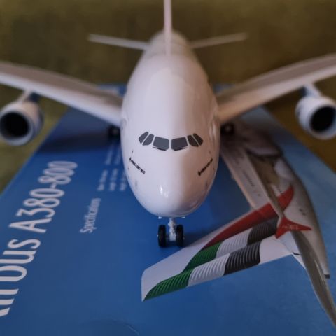 Emirates Airbus A380 lentomalli, valkoinen väri. Malli esittää Emiratesin Airbus A380 -lentokonetta ja sisältää jalustan. Sopii koristeeksi tai keräilyyn. Koko: 29cm x 33cm