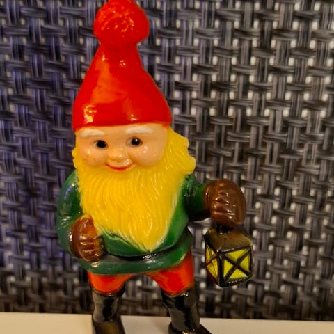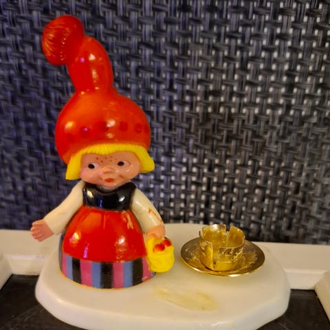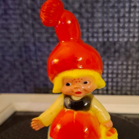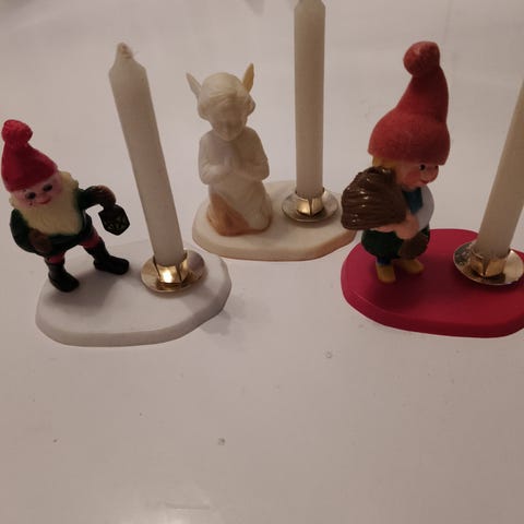 Karen K retro tonttu koristeet avaamattomissa pakkauksissaan. Isomman korkeus noin 14 cm, pienempi noin 9,3 cm.