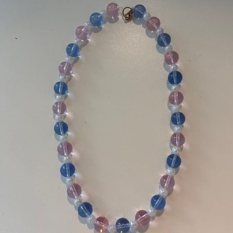 Kaunis kaulakoru jossa lasisia helmiä ja metallisia ruusuja