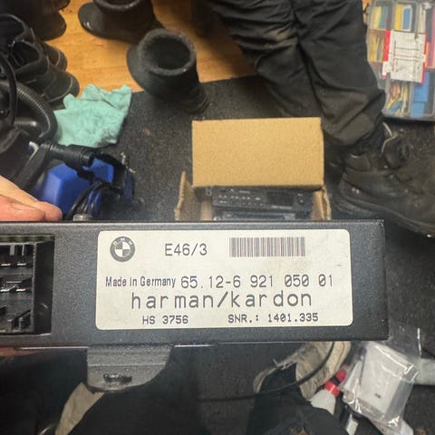Kuvien hattuhyllyn harman kardon kaiuttimet ja vahvistin, peräisin 2002 e46 bmw.