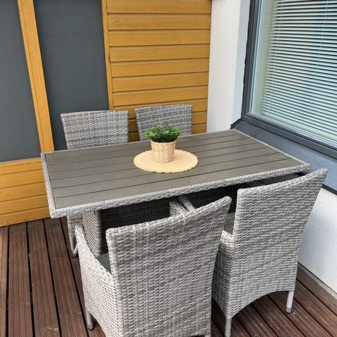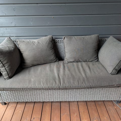 Rottinkinen sohva, pöytä ja kaksi rottinkituolia, jotka sopivat sisä- tai ulkokäyttöön. Tyynyt eivät kuulu sarjaan mutta saa mukaan jos haluaa. Toinen pöytä kaupan päälle.