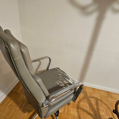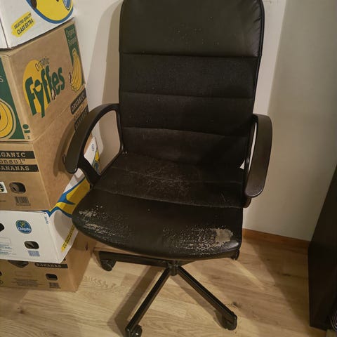 Annetaan kulunut työtuoli jos jollekin olisi vielä iloksi. Istuinosa kulunut hieman, selkänojan yläosassa kissojen raapimisjälkiä. Kissatalous, nouto Olarista viim 28.12.