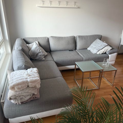 Harmaa kulmasohva, sohvan materiaali on kangas, ja se sopii olohuoneen kalusteeksi. Sohva tarjoaa istumatilaa useammalle henkilölle ja on muodoltaan L-mallinen.