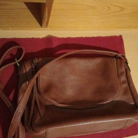 Turkoosi käsilaukku pitkällä ja lyhyellä hihnalla.