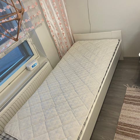 Ikean 90-senttinen sänky, alla kaksi säilytyslaatikkoa. Patja ja kohtuukuntoinen petsri. Vain nouto, itä-helsinki.