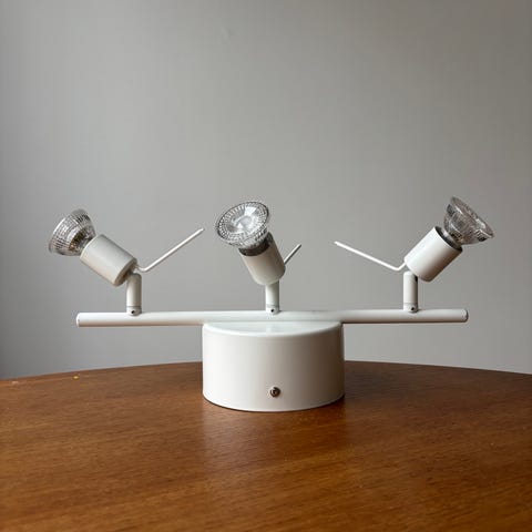 Myydään IKEA TROSS -kattovalaisin, jossa on kolme spottia ja valkoinen viimeistely. Mukana 3 lamppua.