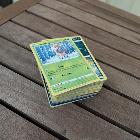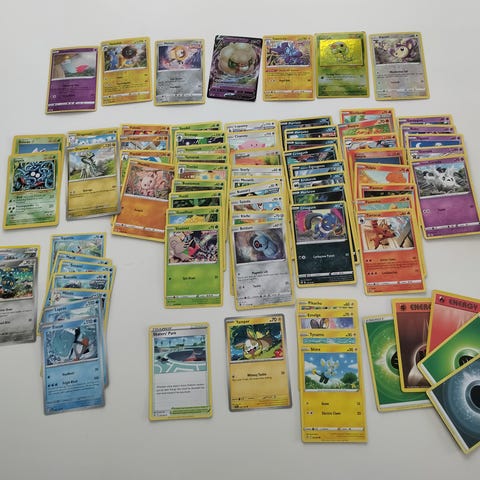 Pokémon keräilykortit eri hahmoilla ja ominaisuuksilla. Kortit sisältävät hahmojen nimiä, hyökkäyksiä ja erikoisominaisuuksia. Kortit sopivat keräilyyn ja peliin.