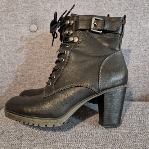 Pari krt käytetyt tyylikkäät nilkkurit, reilu 39 (sopii myös 40). Korkea varsi, käsintehty pitävä pohja, korko 3, kokonaiskorkeus 18,5 cm. Synteettinen mokkanahkaa, fleece vuori. Nouto 00250.