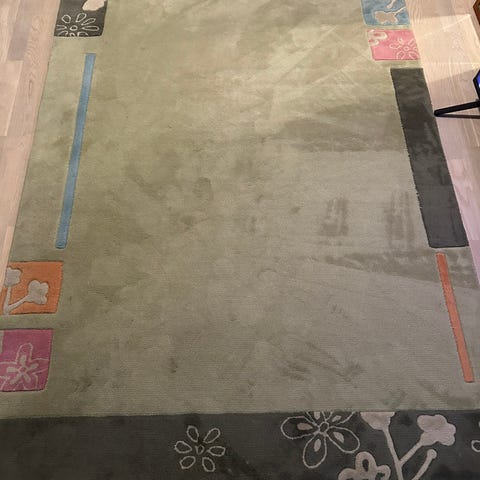 Puhdas ja siistikuntoinen makuuhuoneen matto 193x132cm, väri vaalea roosa, valkoiset kuviot.