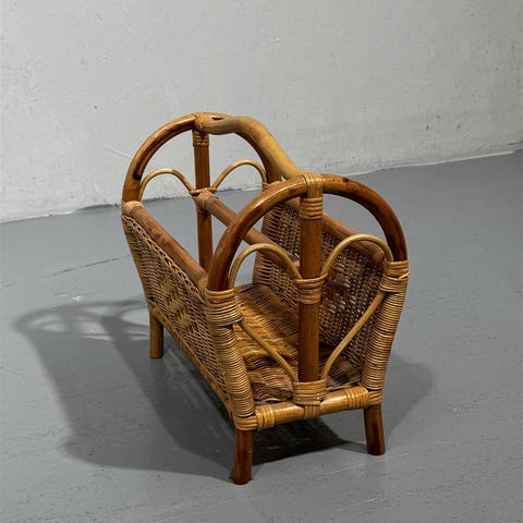 Vintage-lehtiteline, joka on valmistettu rottingista. Tämä teline on suunniteltu pitämään lehdet ja aikakauslehdet järjestyksessä ja helposti saatavilla.Telineessä on näkyvissä jonkin verran kulumaa ja patinaa, mikä on tyypillistä tämän ikäiselle esineelle. Rottinki on säilynyt ehjänä, mutta pinnassa on pieniä naarmuja ja värimuutoksia. Yleiskunto on kuitenkin hyvä ja teline on edelleen täysin käyttökelpoinen.