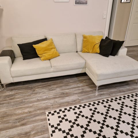 Sohva on pesty vasta tekstiilipesurilla ja kaikkien tyynyjen päälliset irroitettu ja pesty koneessa hajusteettomalla pesuaineella.