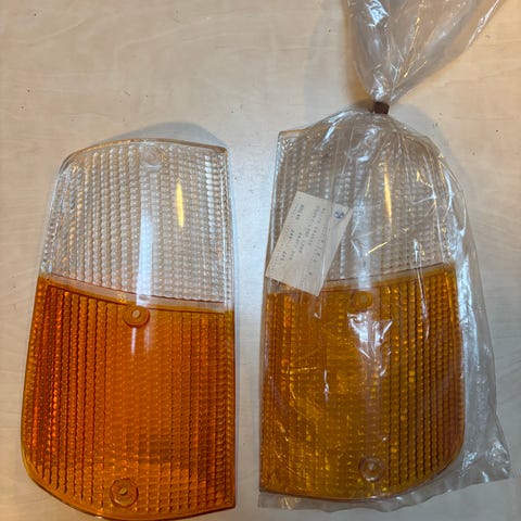 Volvo 240/245/260 etuvalosuojat vm1986, joista toinen avaamaton uusi ja toinen ilmeisesti uuteen vaihdettu, jossa pieni halkeama.