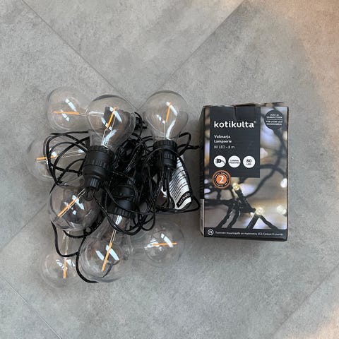 N. 3 metriä pitkä valonauha + n. 4,5 m alkujohto. Useita valotoimintoja.