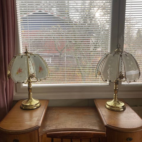 Kaksi samanlaista pöytävalaisinta, ilman lamppuja. Korkeus varjostimen kanssa 41 cm. Varjostimen alareunan halk. 20 cm, yläreuna 15 cm. Hinta molemmat yhteensä 20 eur.