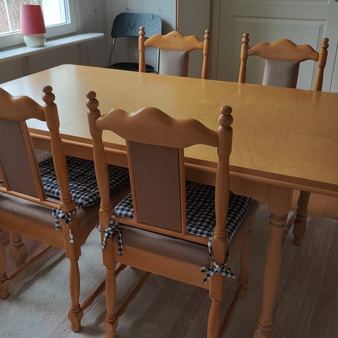 Myydään puinen ruokailuryhmä. Siisti yleisilmeeltään vaikka käytön jälkeä näkyykin. Käsistään näppärä saa taiottua tästä kuin uuden. Ostettu aikoinaan Maskusta.