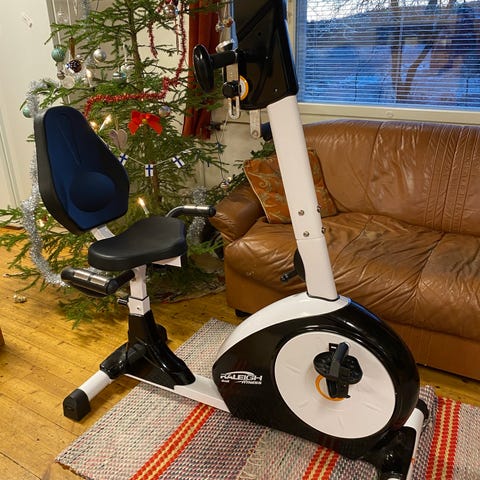 Karhu-merkkinen kuntopyörä valkoisella rungolla. Sisältää digitaalisen näytön, jolla voi seurata harjoituksen kestoa, matkaa ja muita mittareita. Soveltuu sisäpyöräilyyn ja kuntoharjoitteluun.