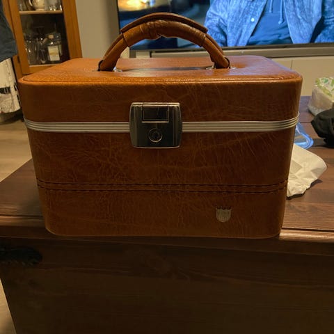 Kovamuovinen tummanpunainen aito Delsey beautybox/meikkilaukku. Numerolukko (ei ohjelmoitu), irrotettava välijakaja sisällä. Pääliosan meikkilokero kadonnut.