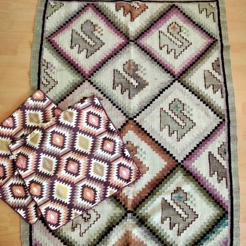 KILIM - punainen ja sininen kuvioitu jouluinen matto, jossa on geometrinen ja perinteinen kuviomalli. Matto sopii sisäkäyttöön ja lisää väriä sekä kuviota huoneen sisustukseen. Molempi puoli voi käyttää. Matossa on noin 12 cm hapsut molemmissa reunassa. Nouto!
