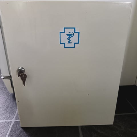 Valkoinen metalli pelti kaappi vihreällä ristillä