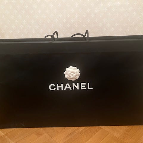 Uusi musta Chanelin laatikko, jota ei ole vielä koottu. Koko: 55x40x23