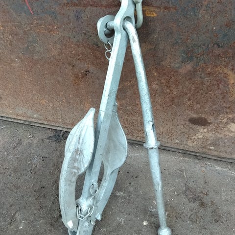 Metallinen ankkuri, paino 10 kg. Sopii veneen tai muun vesikulkuneuvon kiinnitykseen. Koko noin 70 cm pituudelta.