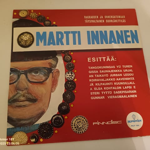 Martti huuhaa innanen päreitä kainalossa vinyylilevy. Erittäin hyväkuntoinen levy ja kansi