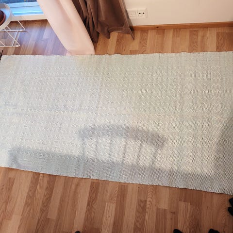 Vihreä matto, jossa on valkoisia ja ruskeita kukkakuvioita. Sopii erilaisiin sisustustyyleihin ja tarjoaa pehmeän pinnan lattialle.
