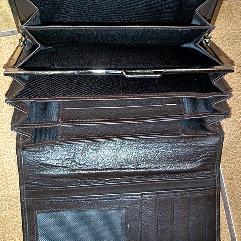 Koko n. 6,3 x 10,8 cm. Jonkin verran kulumaa keinonahkaosuuksissa.