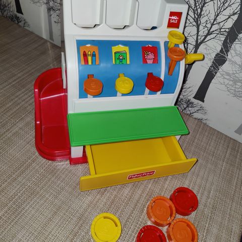 vintage Fisher Price kassakone + 3 rahaa. 2-6 vuotiaille