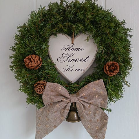 Metallihenkariin tehty kranssi katajan havuista