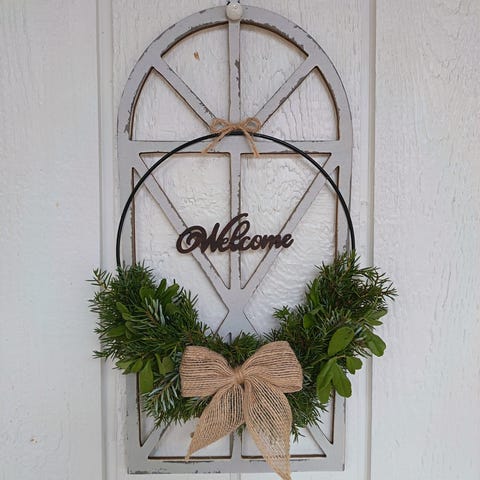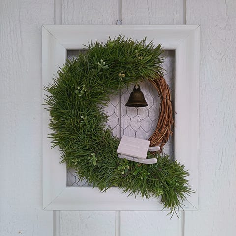 Vanhaan kehykseen ja mustaan metallirenkaaseen katajan ja männyn havuista sekä tekokasveista tehty kranssiasetelma.