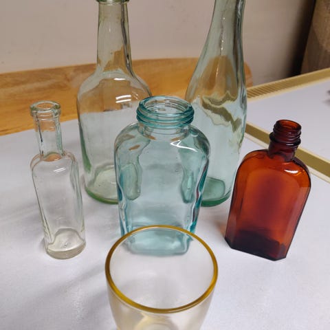 Vintage lasipulloja 1 euro kpl. Kirkkaan lasisia pulloja eri kokoisina. Pullojen materiaali on lasi, väri kirkas, vanhaa lasia, joissa näkyy jopa puhalluskuplia. Soveltuu koristekäyttöön. Voin lähettää yksittäin tai kaikki kerralla. Mmm.