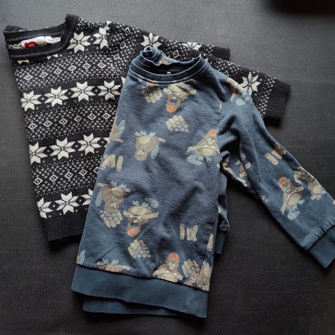 Pieni vaatepaketti, muumitunika 104 (pesuhaitua), kahdet mustat ehjät housut: me&i samettipinta (98/104, vastaa 104) ja h&m 104 kokoa. Toridiili