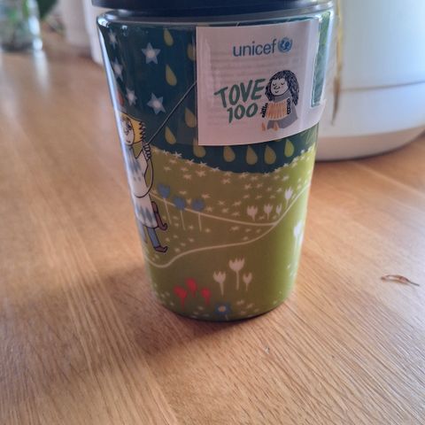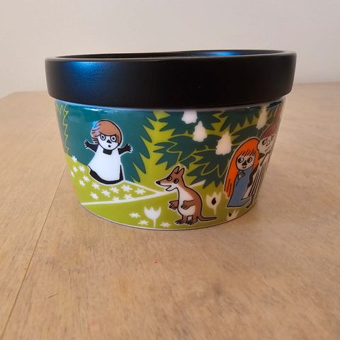 Muumi metallipurkki, Tove 100, jossa sininen kansi ja muumihahmojen kuvitus. Purkki on tyhjä ja kannellinen, soveltuu säilytykseen. Hyvässä kunnossa. Hinta 7 euroa. Voin lähettää. Mmm.