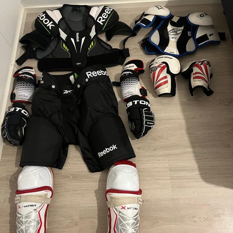 VCM ja Bauer hanskat 12”, Bauer housut n. 140-150cm. hanskat 15€/pr, housut 30€.