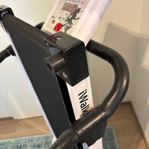 Walk kävely/juoksumatto, joka soveltuu kotikäyttöön. Juoksumaton pinta on musta ja runko valkoinen. Laite sisältää käsikahvat ja näyttöpaneelin, joka näyttää harjoittelutiedot.